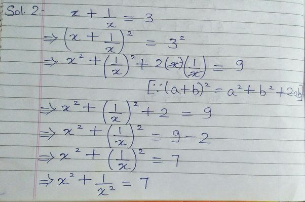 Laten we nu de daad bij het woord voegen en de oplossing stap voor stap bekijken. Begin met de vergelijking x + 1/x = 3. Kwadrateer beide zijden: (x + 1/x)² = 3². Dit geeft ons x² + 2(x)(1/x) + 1/x² = 9. Vereenvoudig dit tot x² + 2 + 1/x² = 9. Trek nu 2 af van beide zijden: x² + 1/x² = 7. En voilà, de oplossing is 7!